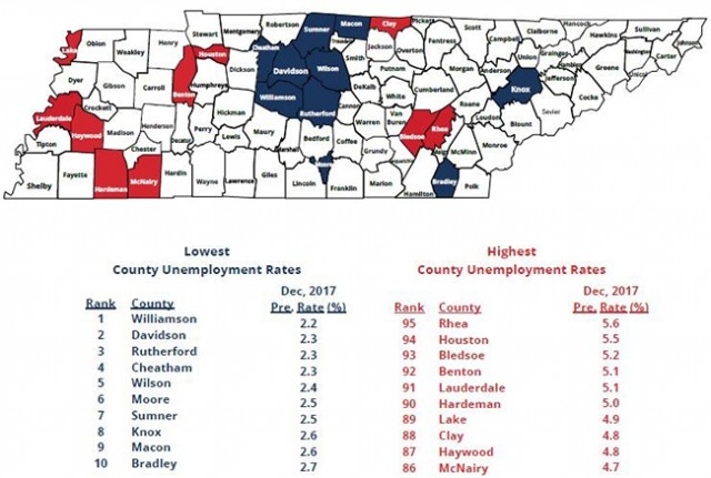 Tennessee Counties End 2017 With Continued Low Unemployment