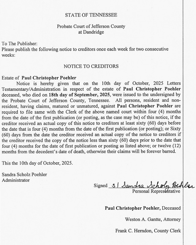 PUBLIC NOTICE – NOTICE TO CREDITORS – PAUL CHRISTOPHER POEHLER