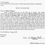 PUBLIC NOTICE – NOTICE TO CREDITORS – ESTATE OF CLIFFORD COLEMAN