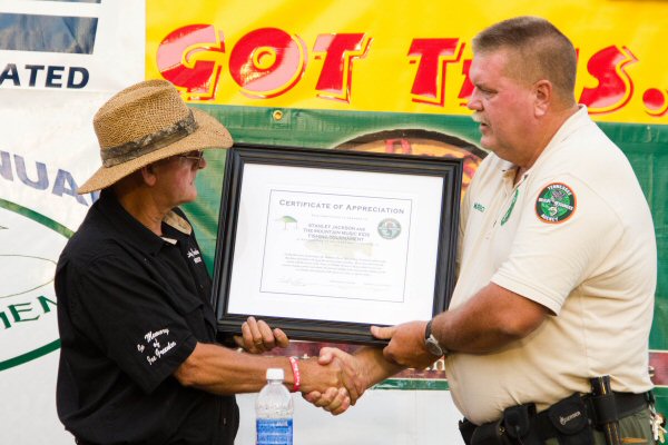 It was the mother of 15 year old Evan, a young gentleman who was diagnosed a year ago with bone cancer, who made the phone call to Mrs. Jackson that resulted in the Jackson’s reconsideration of their decision to cancel this year’s tournament. Mr. and Mrs. Jackson had had a difficult year and were contemplating doing away with tournament. It was the request from Evan to be in the tournament that caused Mr. & Mrs. Jackson to continue hosting the event. The Tennessee Wildlife Resources Agency presented Stanley Jackson and The Mountain Music Kids Fishing Tournament with a Certificate of Appreciation for all of their hard work.