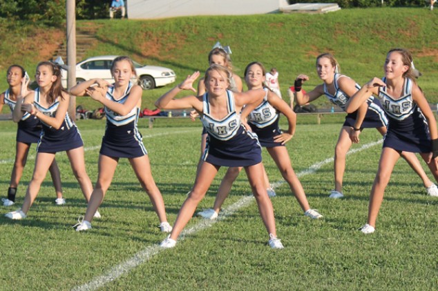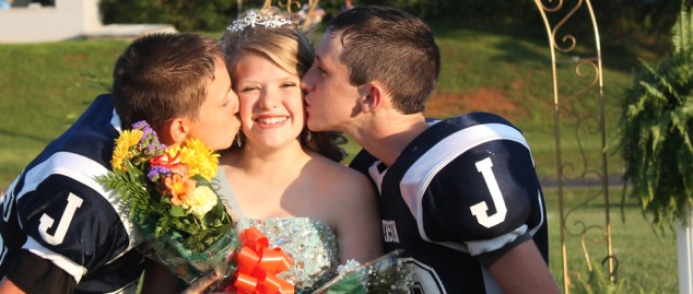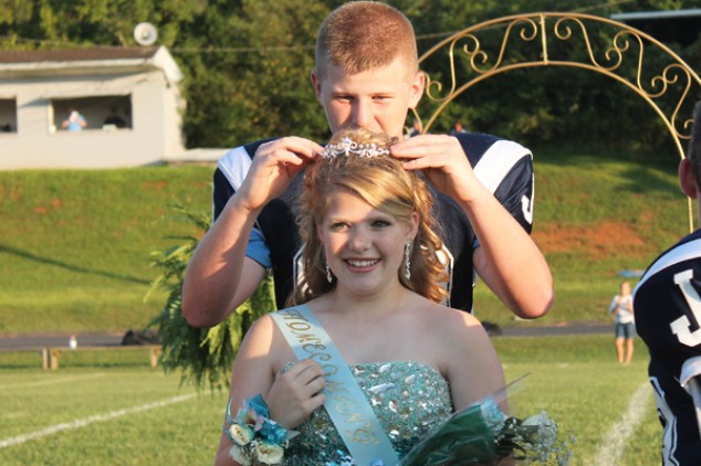 The half-time activities this evening began with performances from the JMS Elks Dance Team and Cheerleading Squad followed by the introduction of this year’s homecoming court representatives. There were two girls representing each of the sixth and seventh grades. Six girls were chosen from the eighth grade homerooms and the queen was chosen from those by student body votes. Makayla Wright, daughter of Jeff and Kim Wright, took the title of 2013 Jefferson Middle School Homecoming Queen. She was escorted by Ronald Damron, son of Ronnie and Cynthia Damron. Makayla was presented with a sash and bouquet by football Captain Josh Finchum and crowned by Captain Zane Long. Captains Reece Watkins and Shane Coffey gave her a congratulatory kiss.