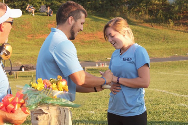Dustin Whitt, one of the JMS Elks assistant coaches, had a special surprise planned. Little did Sarah Hutsell know that she was to be the winner all along and her prize would be a marriage proposal. After her win, Dustin dropped to one knee and, after giving her time to realize what was happening, asked Sarah to marry him. Everyone erupted in applause when she said yes.