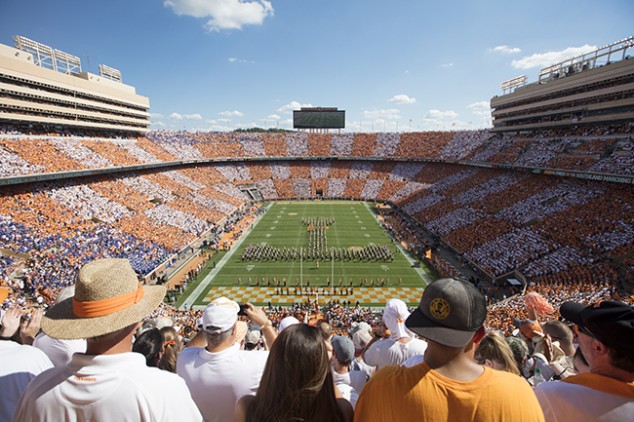 KNOXVILLE, TN - SEPTEMBER 24, 2016 - Pride of the Southland Marching Band makes Power T Logo during the game between the Florida Gators and the Tennessee Volunteers at Neyland Stadium in Knoxville, TN. Photo By John Golliher/Tennessee Athletics