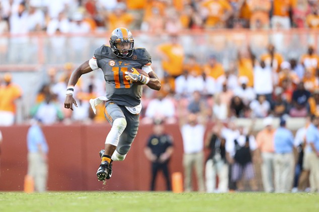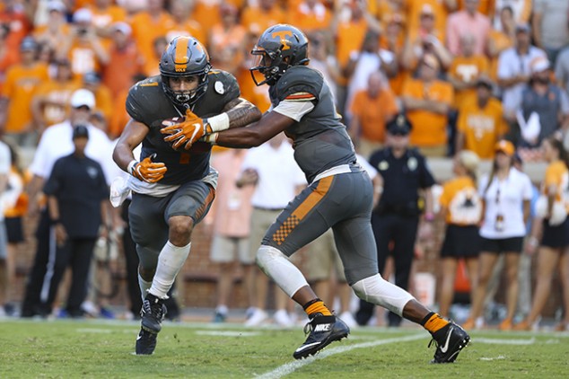 KNOXVILLE, TN - SEPTEMBER 24, 2016 - quarterback Josh Dobbs #11 of the Tennessee Volunteers running back Jalen Hurd #1 of the Tennessee Volunteers during the game between the Florida Gators and the Tennessee Volunteers at Neyland Stadium in Knoxville, TN. Photo By Ruth Dudley/Tennessee Athletics