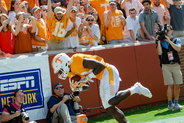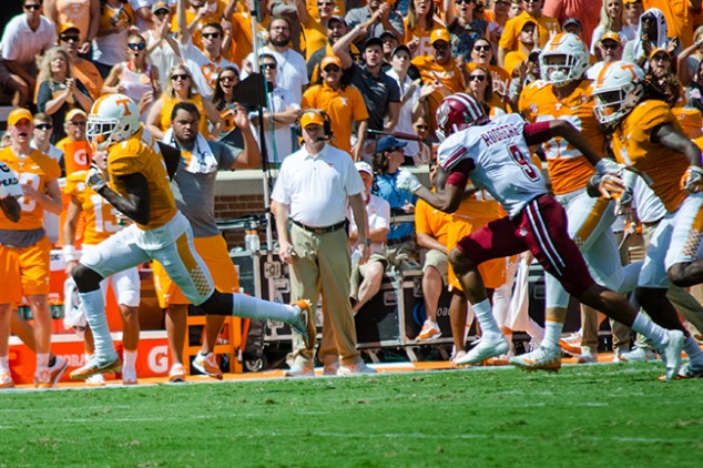 Late in the second quarter, though, John Kelley Jr. broke out a 12 yard run with 4:33 in the half, marking his sixth touchdown of the season. Arron Medley’s extra point was good, and the Vols were finally on the board 7-0. Coach Butch Jones got slapped with an unsportsmanlike conduct call with just over three minutes left in the half. It didn’t take long for UMass to answer. With a quick drive and a 5 yard run, the Minute Men had things tied up for a minute. About 25 seconds before the halftime break, quarterback Quinten Dormandy flung a pass to Tyler Byrd for a Touchdown Tennessee. The teams went to the locker room with the Vols up 14-6.