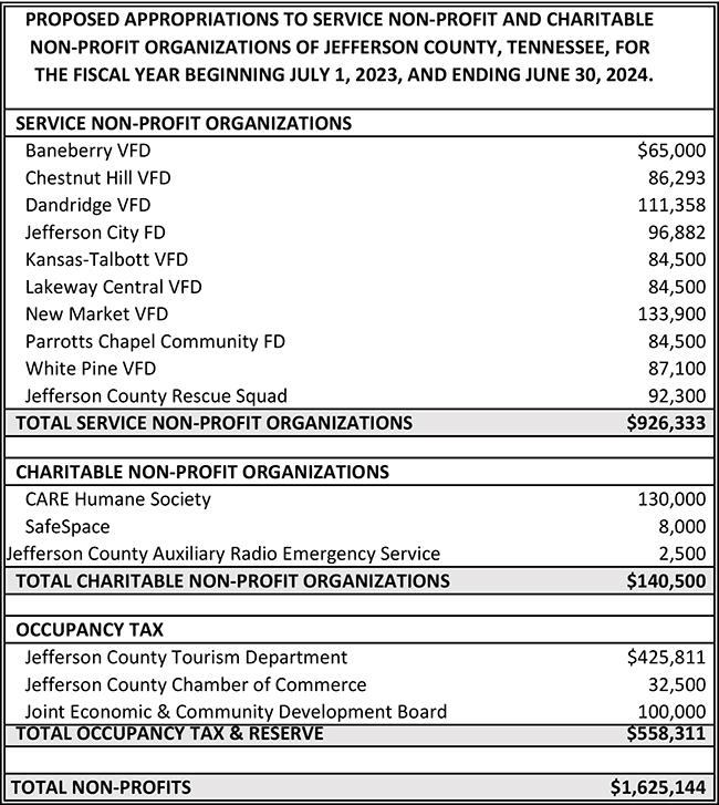 PUBLIC NOTICE – Proposed Appropriations To Service Non-Profit And Charitable Non-Profit Organizations Of Jefferson County, Tennessee, For The Fiscal Year Beginning July 1, 2023, And Ending June 30, 2024