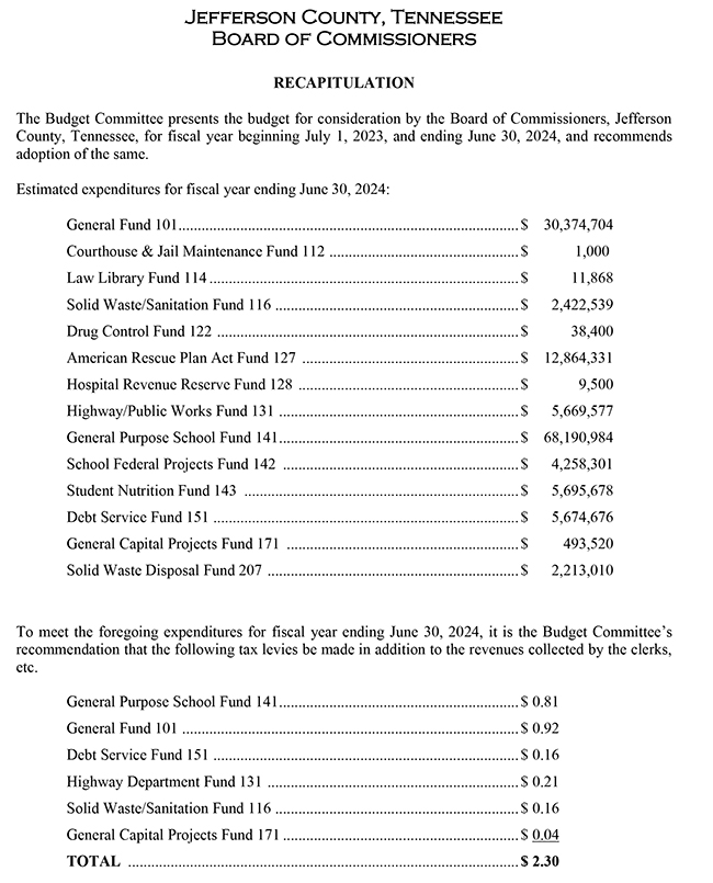 PUBLIC NOTICE – Jefferson County, Tennessee Board Of Commissioners Recapitulation – Budget For Consideration For Fiscal Year Beginning July 1, 2023, and Ending June 30, 2024