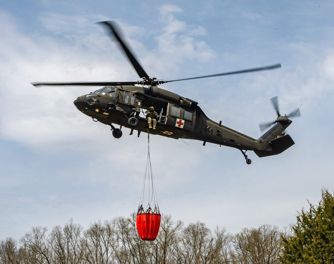 Tennessee National Guard UH-60 Blackhawk helicopter equipped with Bambi Bucket helping put out fires near Pigeon Forge in 2022. (Photo courtesy Knoxville Firefighter crews)