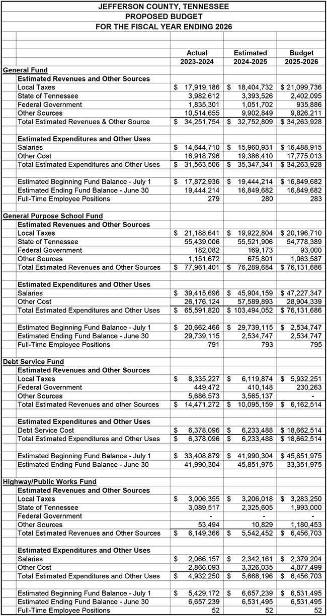 PUBLIC NOTICE – JEFFERSON COUNTY, TENNESSEE PROPOSED BUDGET FOR FISCAL YEAR ENDING 2026 – 3 YEAR COMPARISON