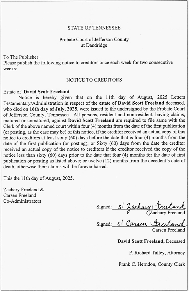 PUBLIC NOTICE – NOTICE TO CREDITORS – ESTATE OF DAVID SCOTT FREELAND