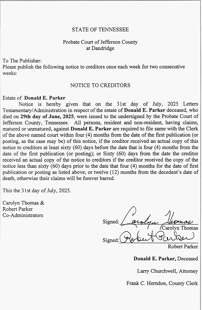 PUBLIC NOTICE – NOTICE TO CREDITORS – ESTATE OF DONALD E. PARKER