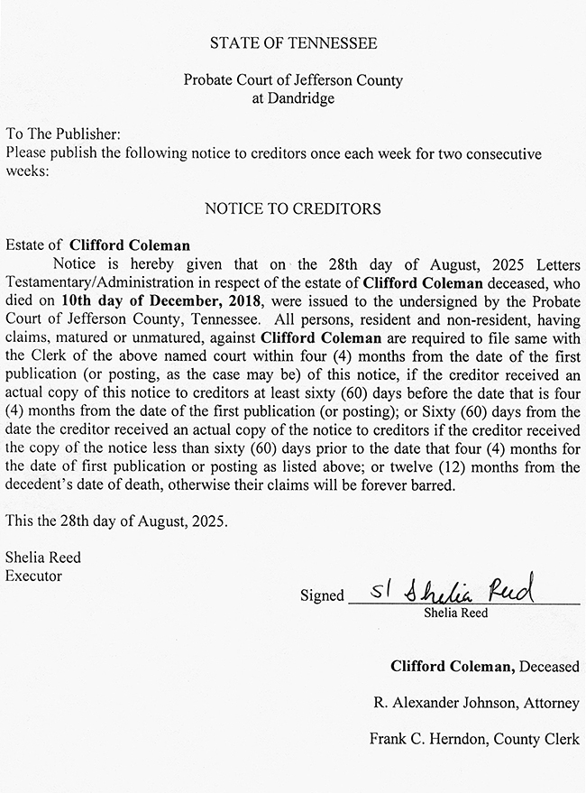 PUBLIC NOTICE – NOTICE TO CREDITORS – ESTATE OF CLIFFORD COLEMAN