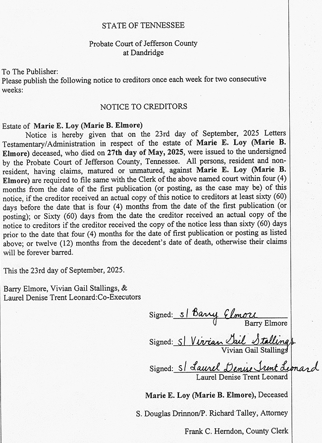 PUBLIC NOTICE – NOTICE TO CREDITORS – ESTATE OF MARIE E. LOY (MARIE B. ELMORE)