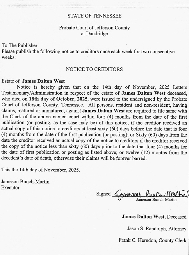 PUBLIC NOTICE – NOTICE TO CREDITORS – ESTATE OF JAMES DALTON WEST