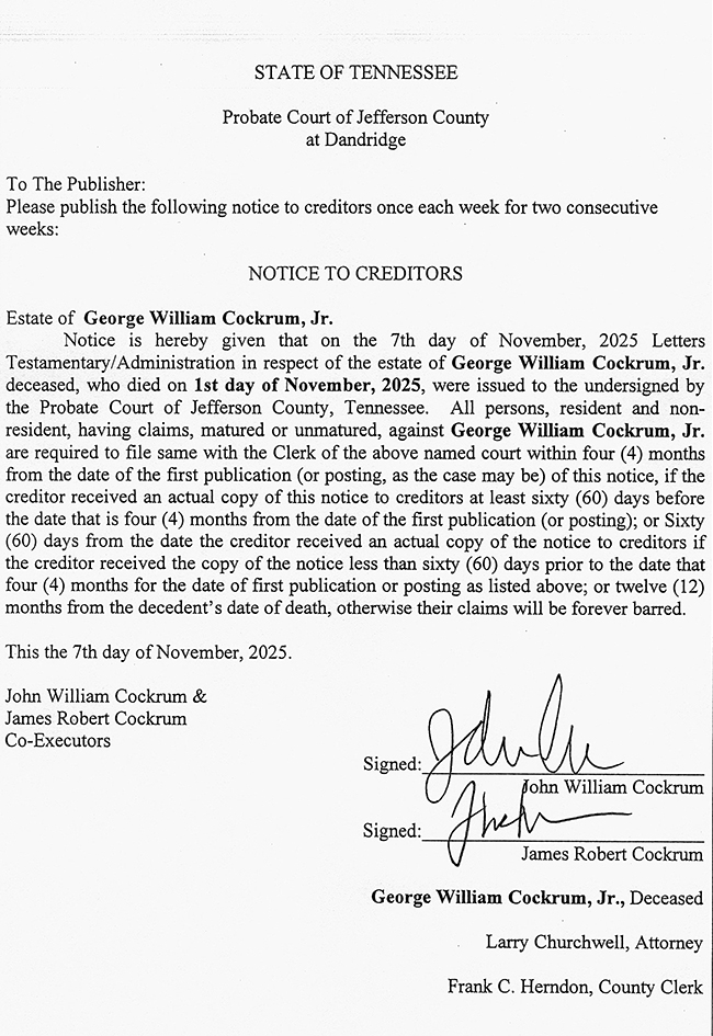 PUBLIC NOTICE – NOTICE TO CREDITORS – ESTATE OF GEORGE WILLIAM COCKRUM, Jr.