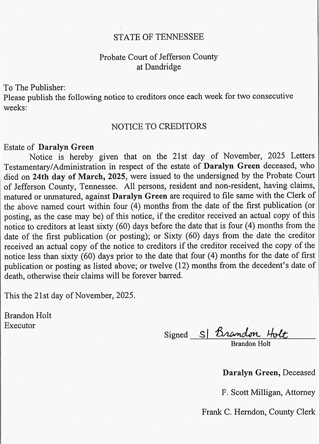 PUBLIC NOTICE – NOTICE TO CREDITORS – ESTATE OF DARALYN GREEN