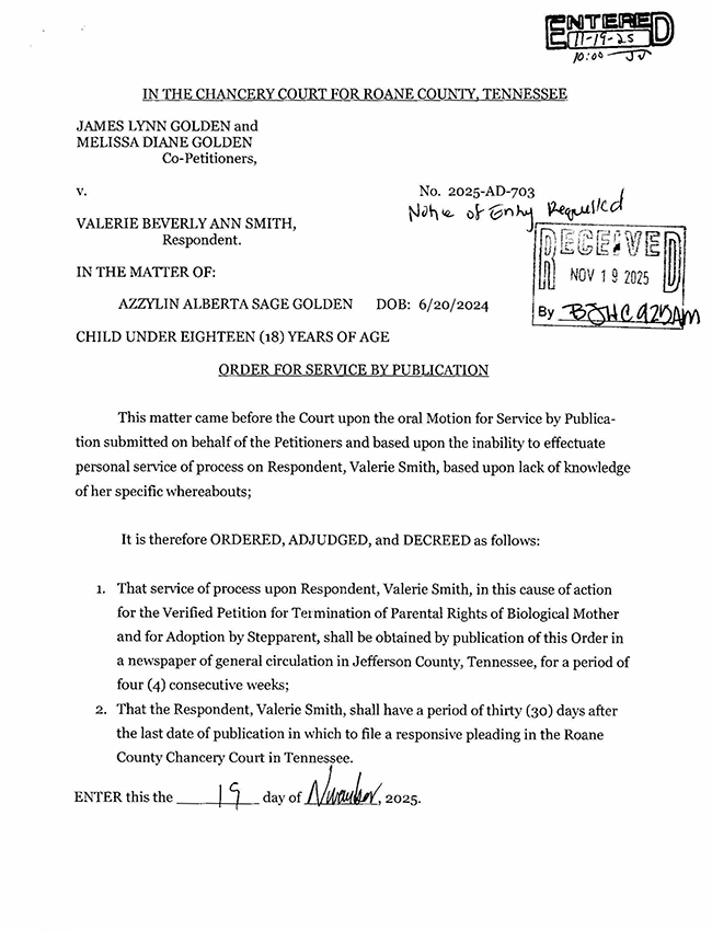 PUBLIC NOTICE – James Lynn Golden and Melissa Diane Golden, v. Valerie Beverly Ann Smith, Order For Service By Publication