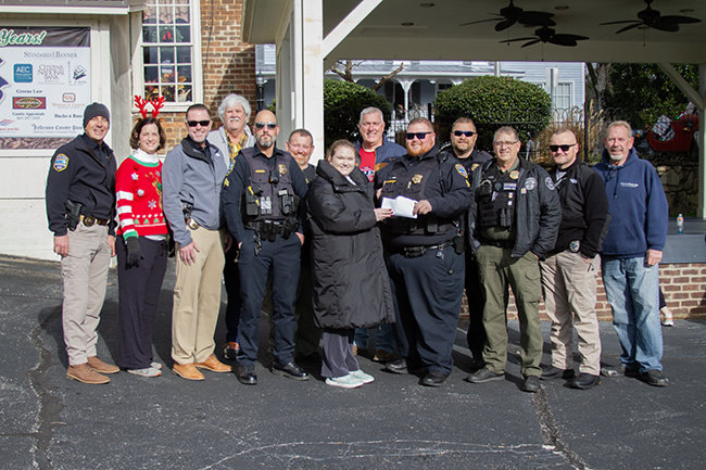 L-R / Dandridge Chief of Police, Phil Batts, Jefferson County Commissoner Katy Huffaker, Detective Bunch, Dandridge Mayor Mike Chambers, Officer Jones, Constable Armour, Event Organizer Ashlin Depew presenting checks and money, Jefferson County Commissioner Randy Bales, Sgt. Hanshew, Sgt. Fair, Constable Hall, Constable Hager, Dandridge Alderman Jeff Depew.