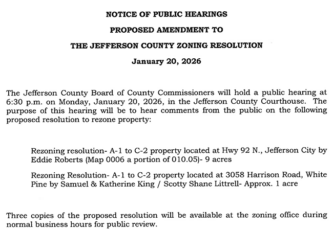 PUBLIC NOTICE – NOTICE OF PUBLIC HEARINGS PROPOSED AMENDMENT TO JEFFERSON COUNTY ZONING RESOLUTION, January 20, 2026