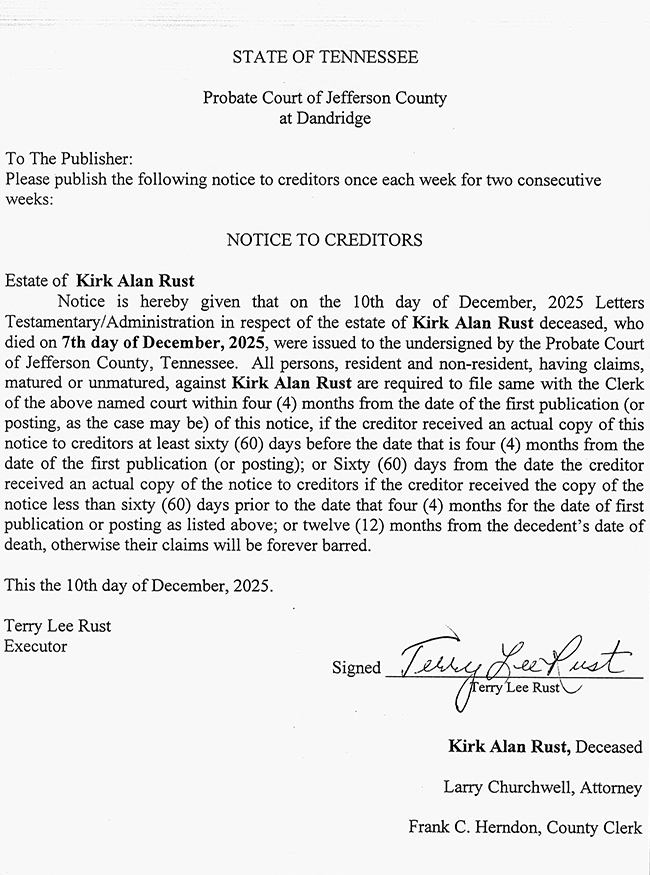 PUBLIC NOTICE – NOTICE TO CREDITORS – ESTATE OF KIRK ALAN RUST