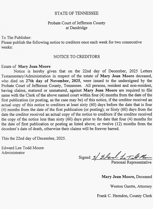 PUBLIC NOTICE – NOTICE TO CREDITORS – ESTATE OF MARY JEAN MOORE