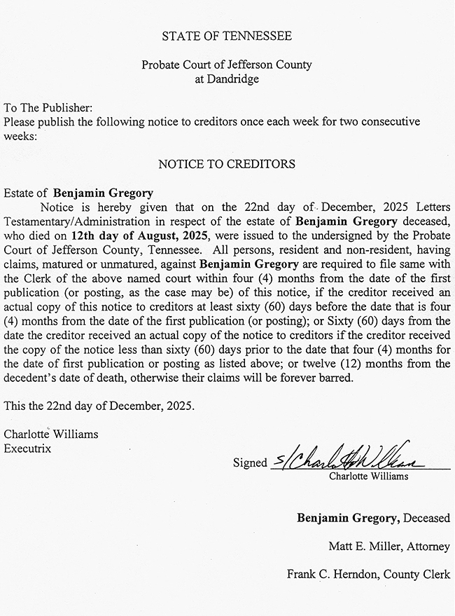 PUBLIC NOTICE – NOTICE TO CREDITORS – ESTATE OF BENJAMIN GREGORY