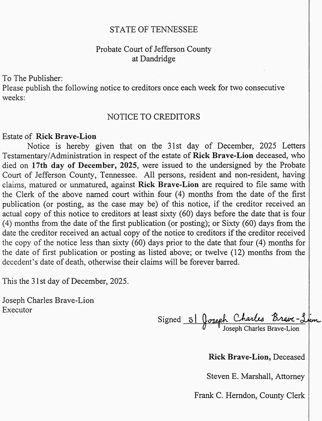 PUBLIC NOTICE – NOTICE TO CREDITORS – ESTATE OF RICK BRAVE-LION