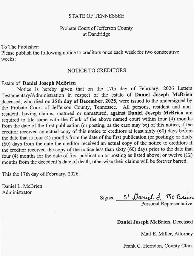 PUBLIC NOTICE – NOTICE TO CREDITORS – ESTATE OF DANIEL JOSEPH McBRIEN