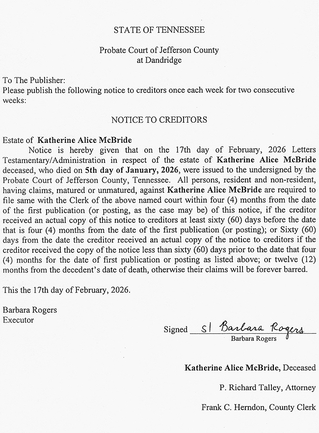 PUBLIC NOTICE – NOTICE TO CREDITORS – ESTATE OF ALICE McBRIDE