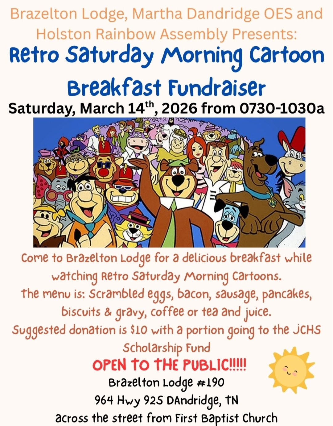 Retro Saturday Morning Cartoon Breakfast Fundraiser by Brazelton Lodge, Martha Dandridge OES and Holston Rainbow Assembly