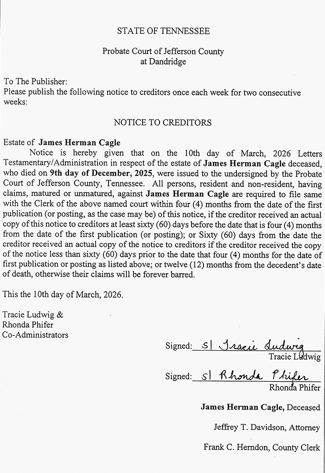 PUBLIC NOTICE – NOTICE TO CREDITORS – ESTATE OF JAMES HERMAN CAGLE