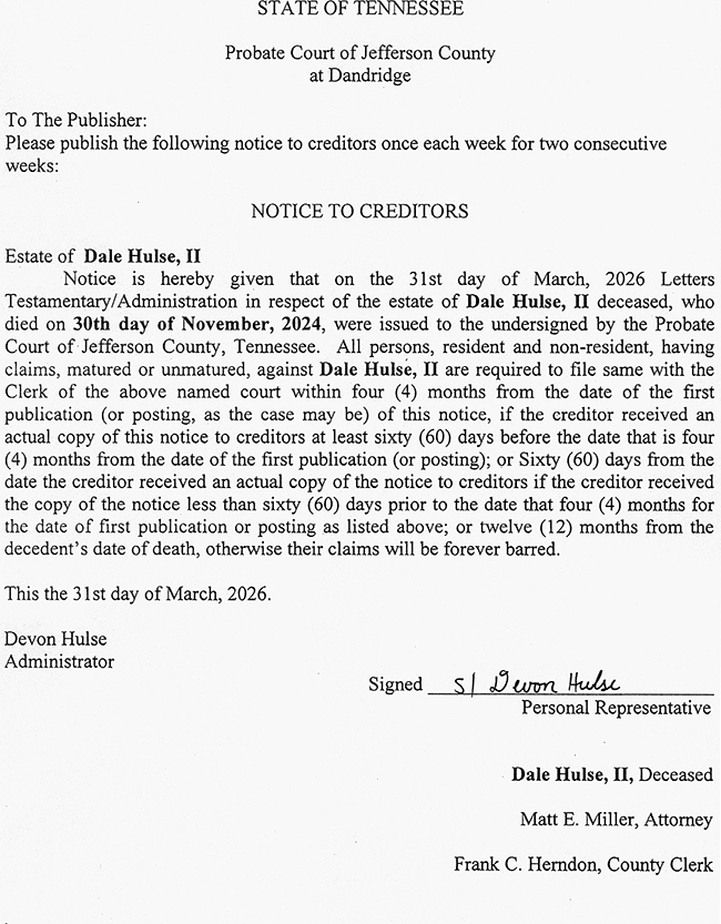 PUBLIC NOTICE – NOTICE TO CREDITORS – ESTATE OF DALE HULSE, II