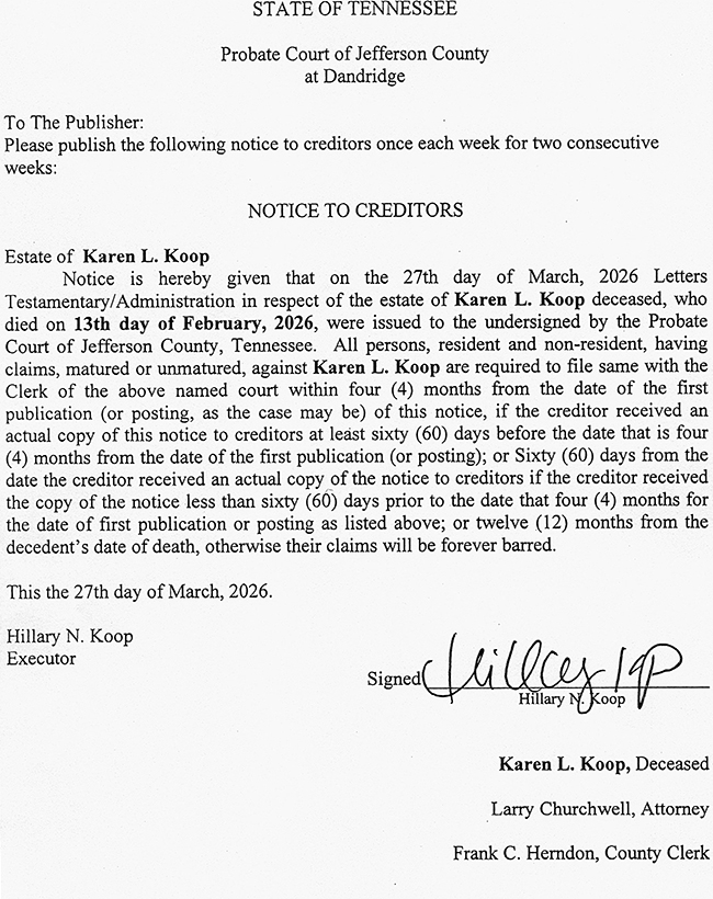 PUBLIC NOTICE – NOTICE TO CREDITORS – ESTATE OF KAREN L. KOOP