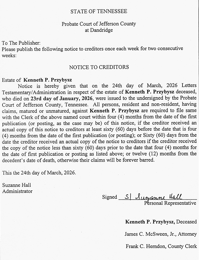 PUBLIC NOTICE – NOTICE TO CREDITORS – ESTATE OF KENNETH P. PRZYBYSZ