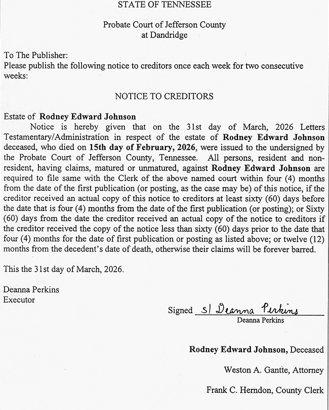 PUBLIC NOTICE – NOTICE TO CREDITORS – ESTATE OF RODNEY EDWARD JOHNSON