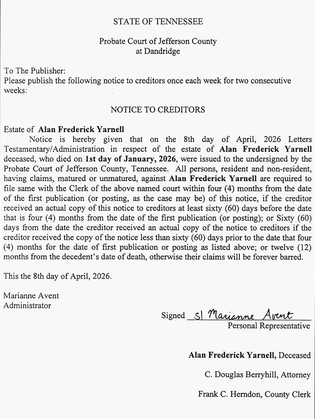 PUBLIC NOTICE – NOTICE TO CREDITORS – ESTATE OF ALAN FREDERICK YARNELL