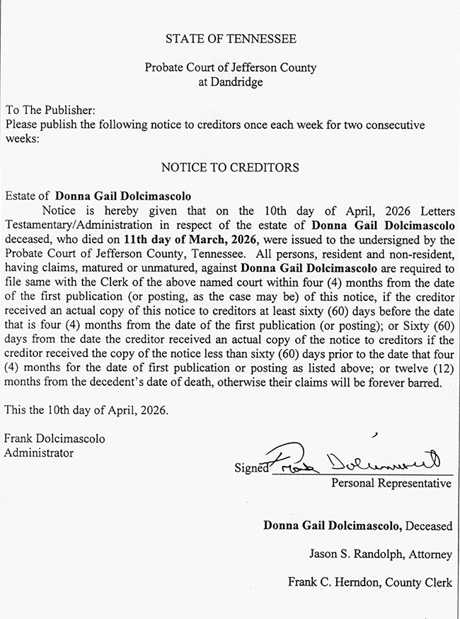 PUBLIC NOTICE – NOTICE TO CREDITORS – ESTATE OF DONNA GAIL DOLCIMASCOLO