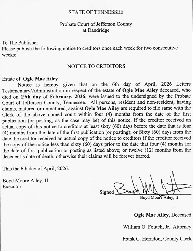 PUBLIC NOTICE – NOTICE TO CREDITORS – ESTATE OF OGLE MAE AILEY