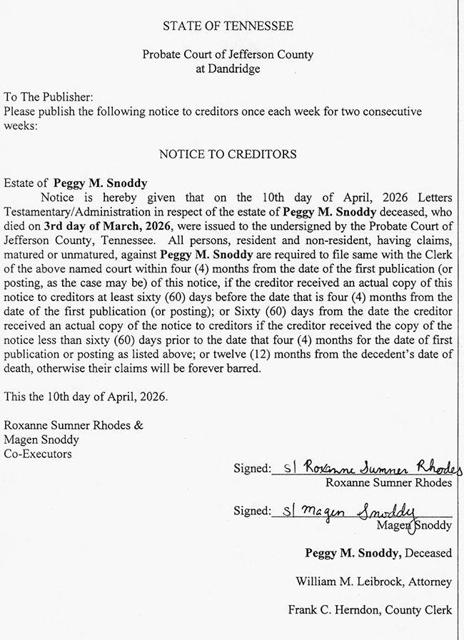 PUBLIC NOTICE – NOTICE TO CREDITORS – ESTATE OF PEGGY M. SNODDY