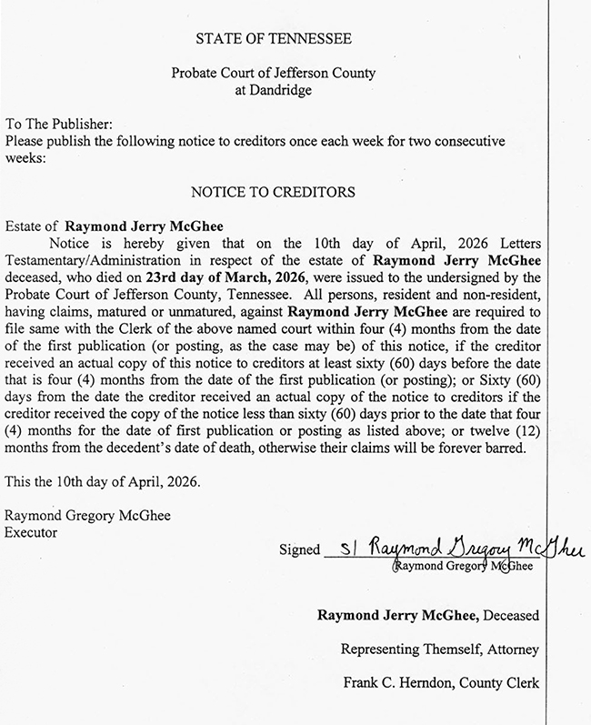 PUBLIC NOTICE – NOTICE TO CREDITORS – ESTATE OF RAYMOND JERRY McGHEE